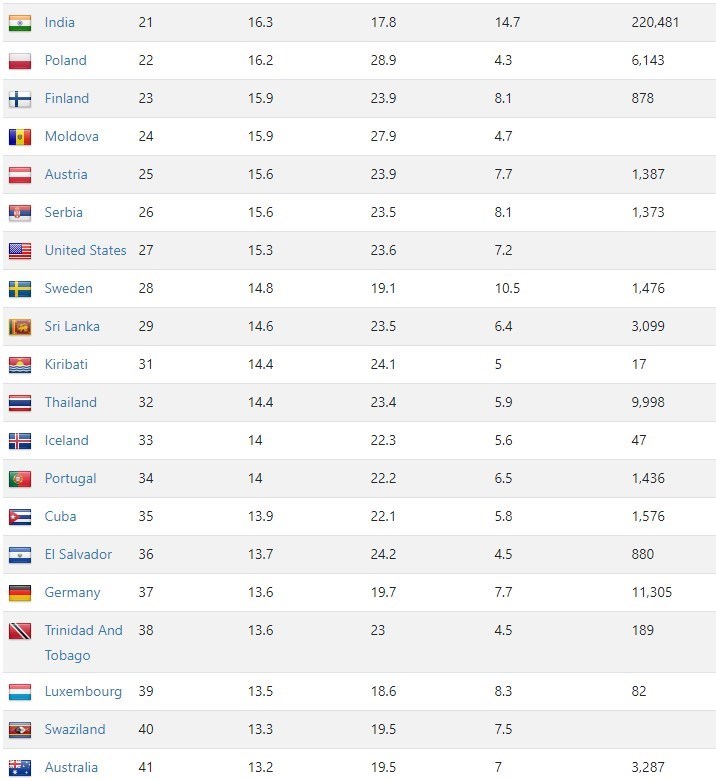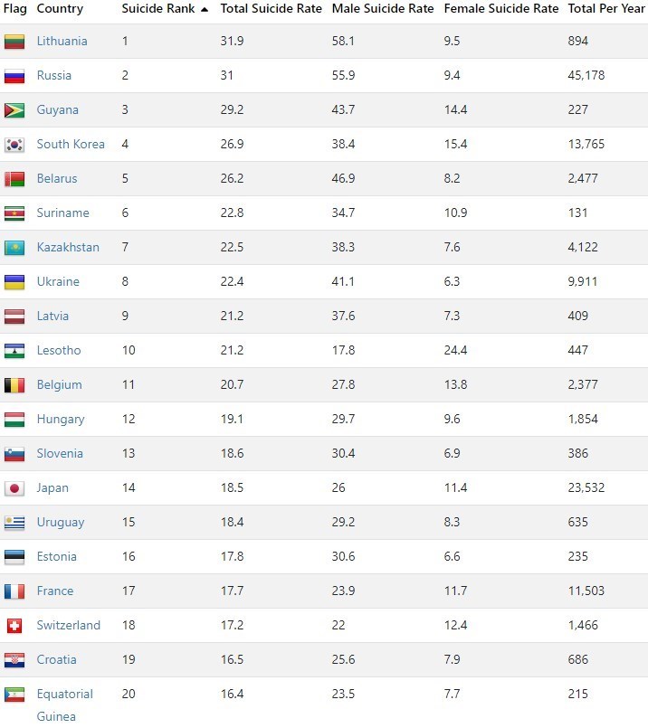این کشورها فقط نمونههایی از کشورهای پیشرفته و صنعتی با آمار خودکشی بالا هستند؛ بر اساس گزارش "World Population Review" نرخ خودکشی هر کشور به شرح زیر است: